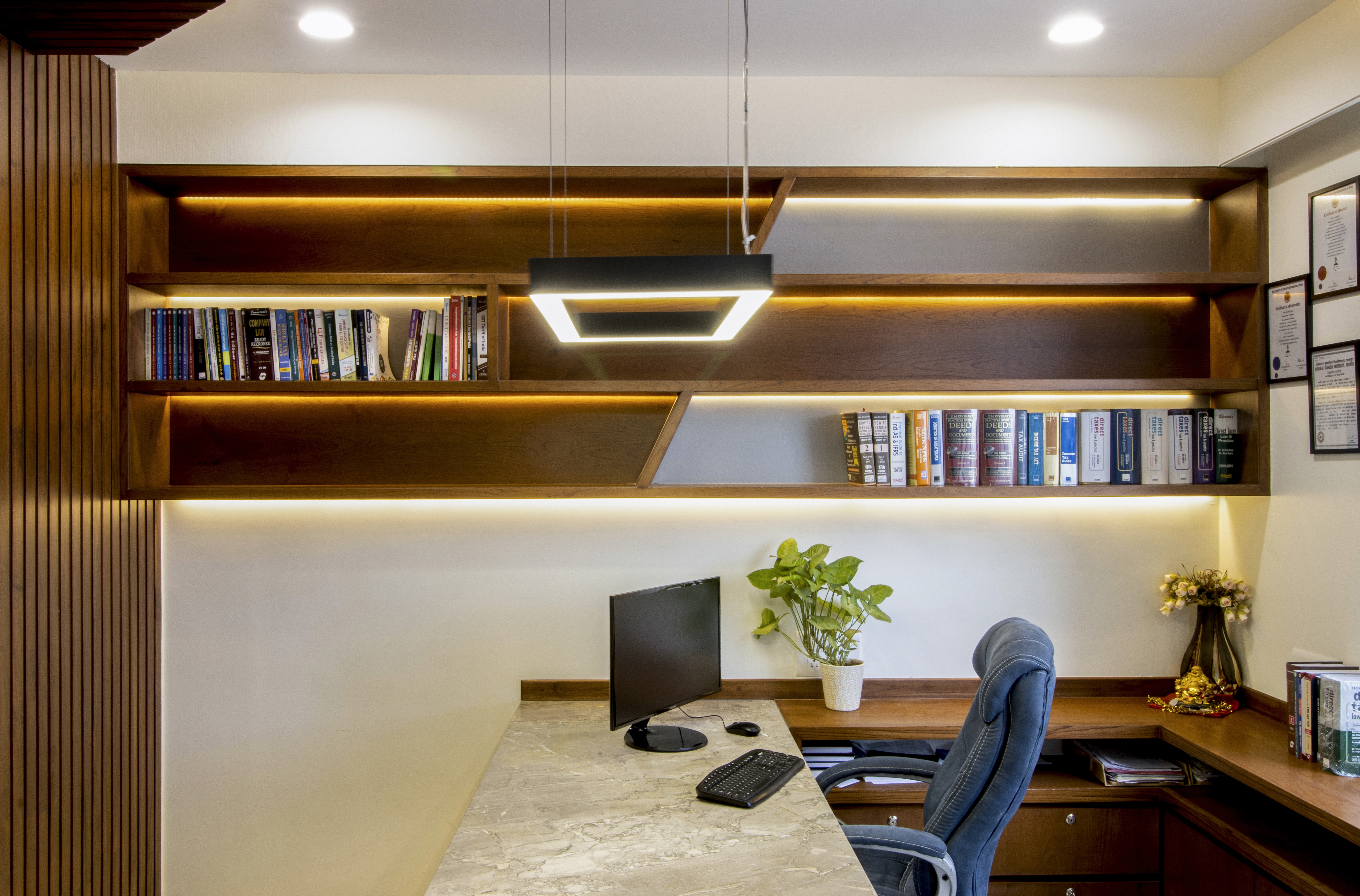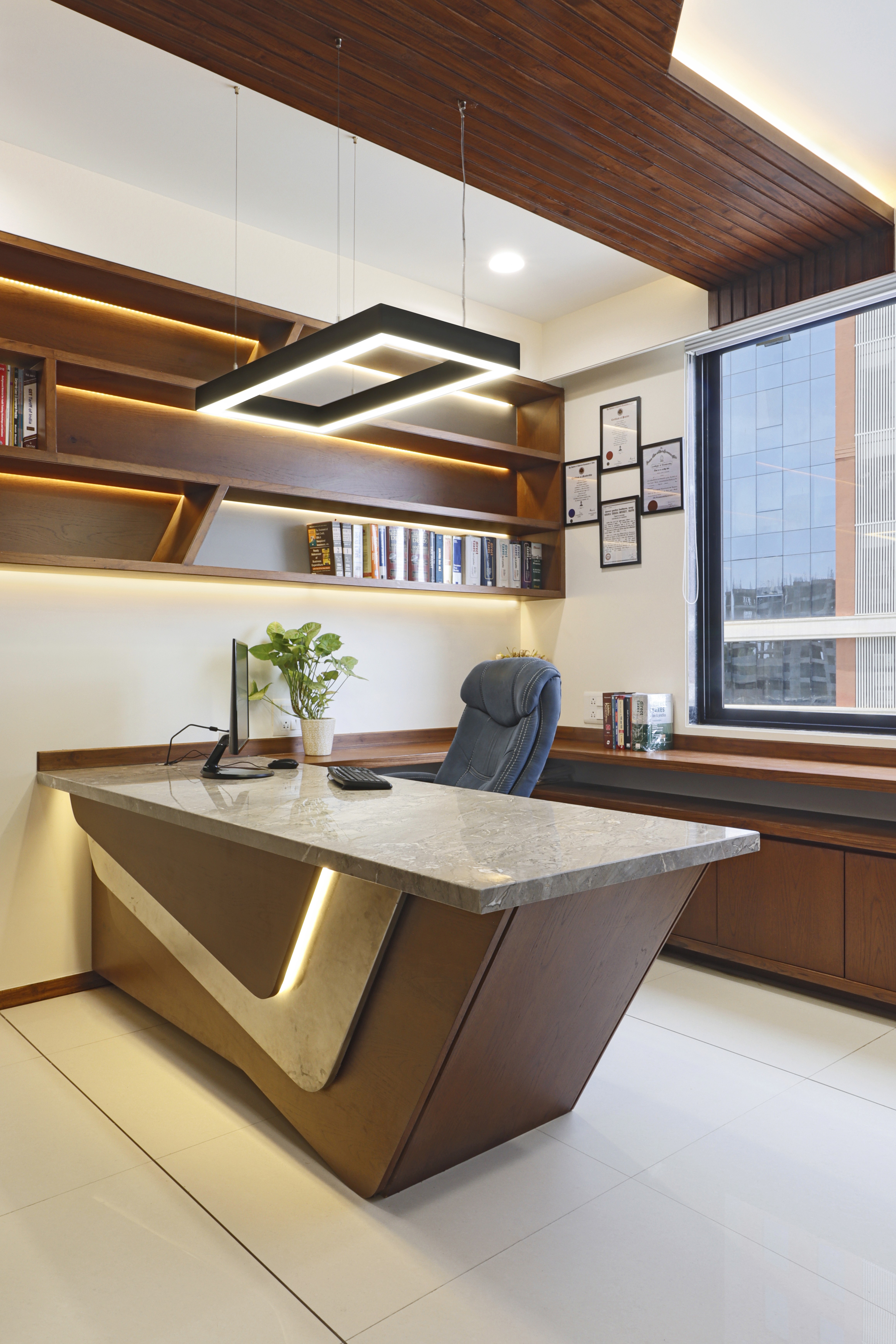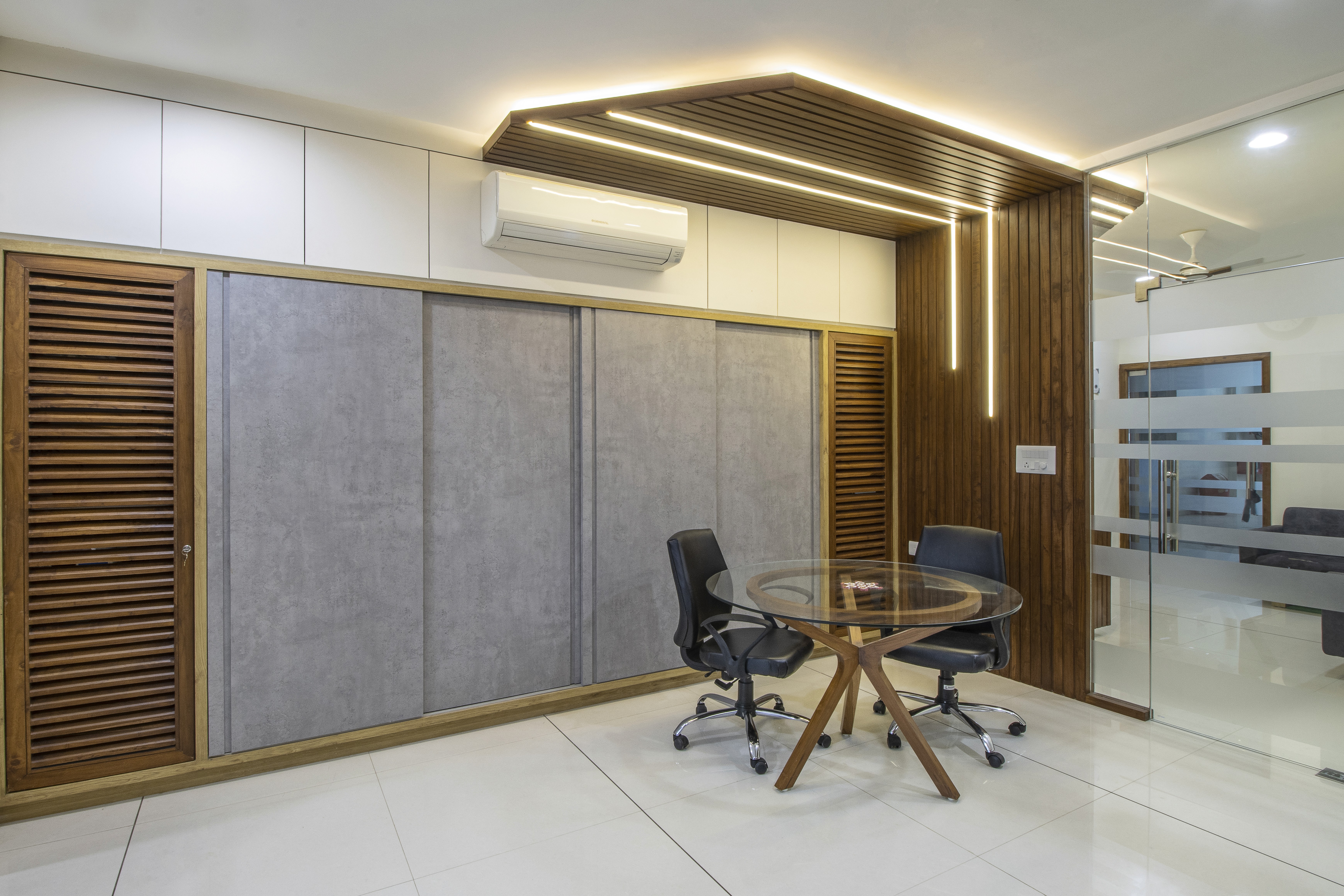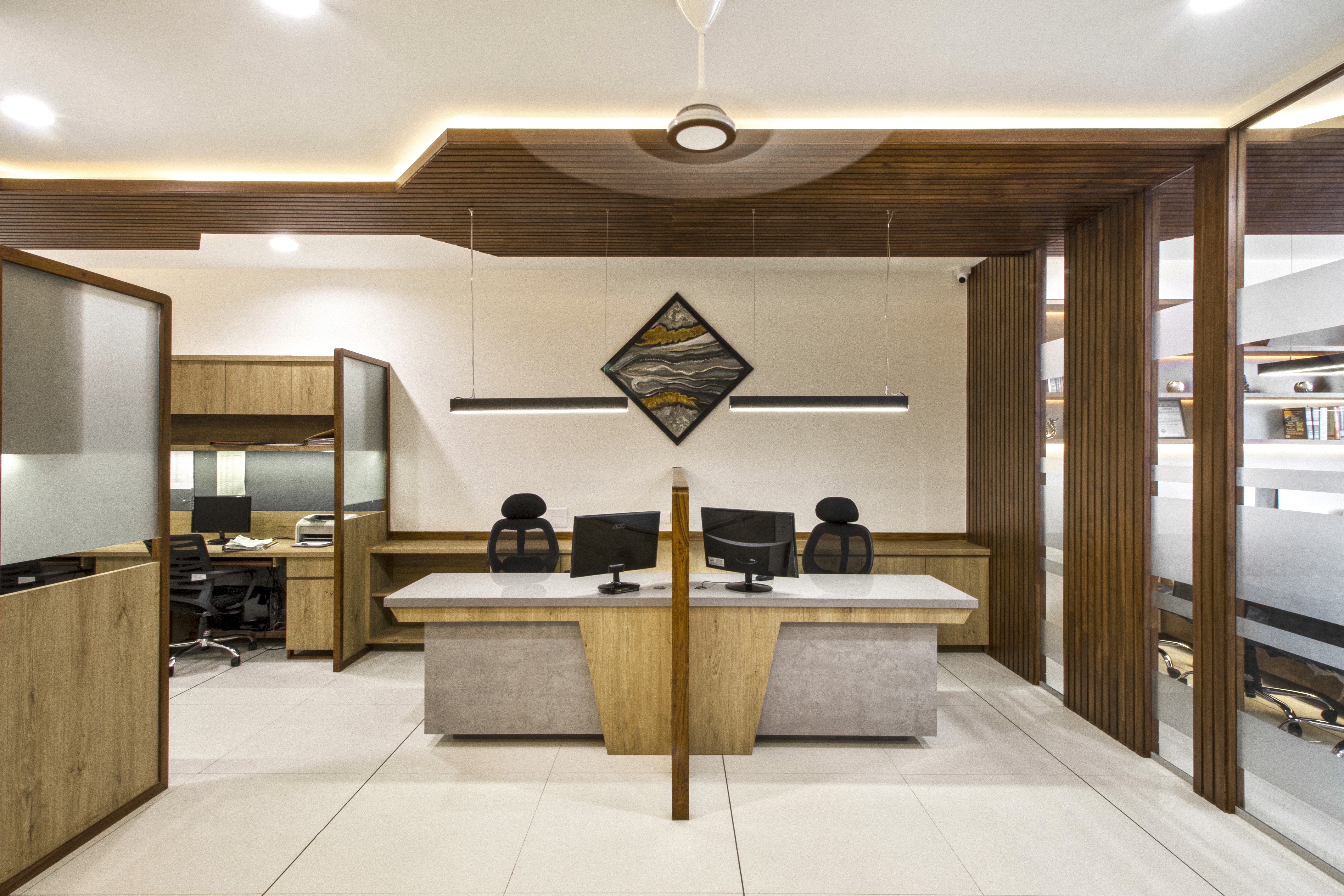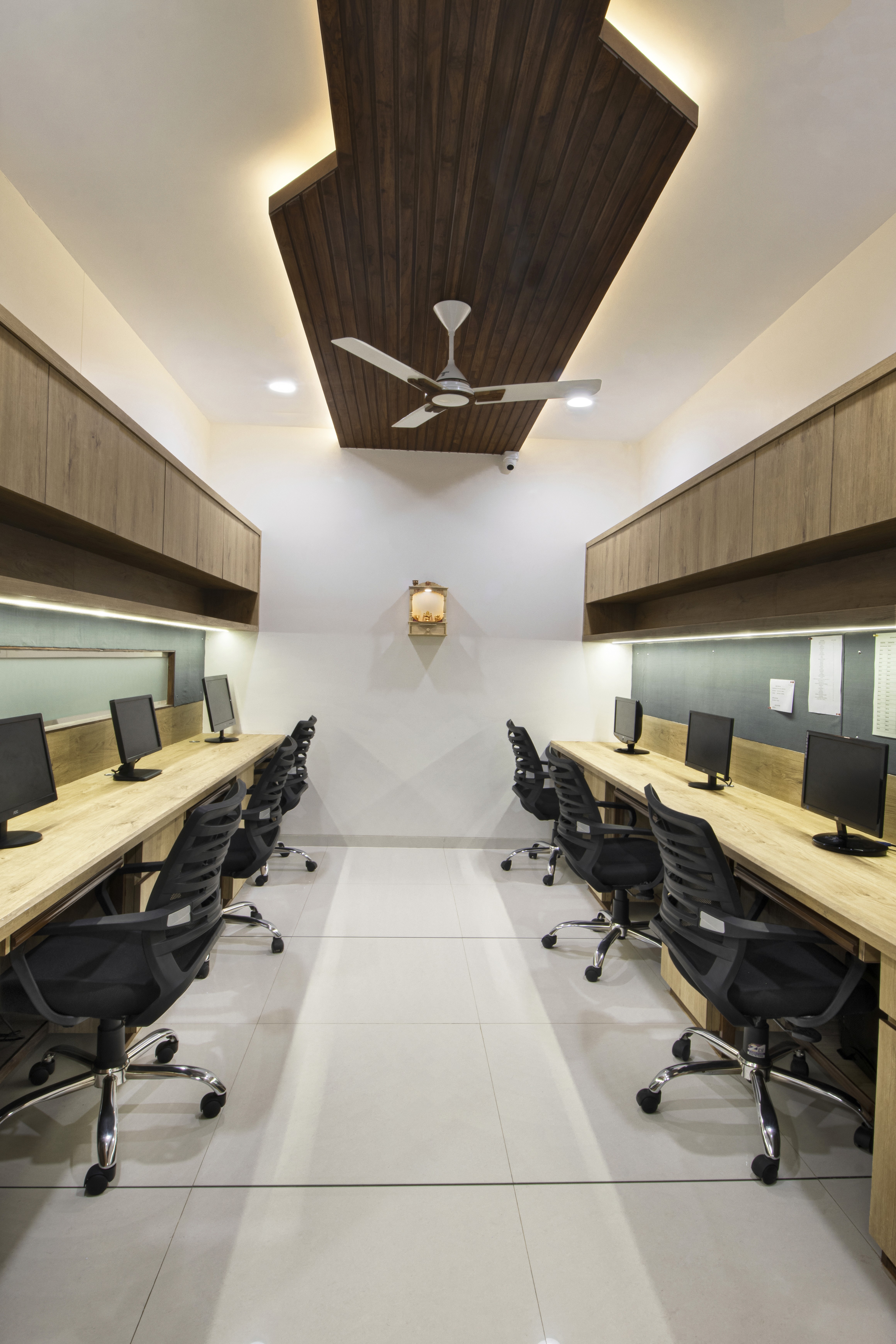Office with pure wood3n ceiling with natural polish work, which is enhanced by white coloured walls act as a background for wood.