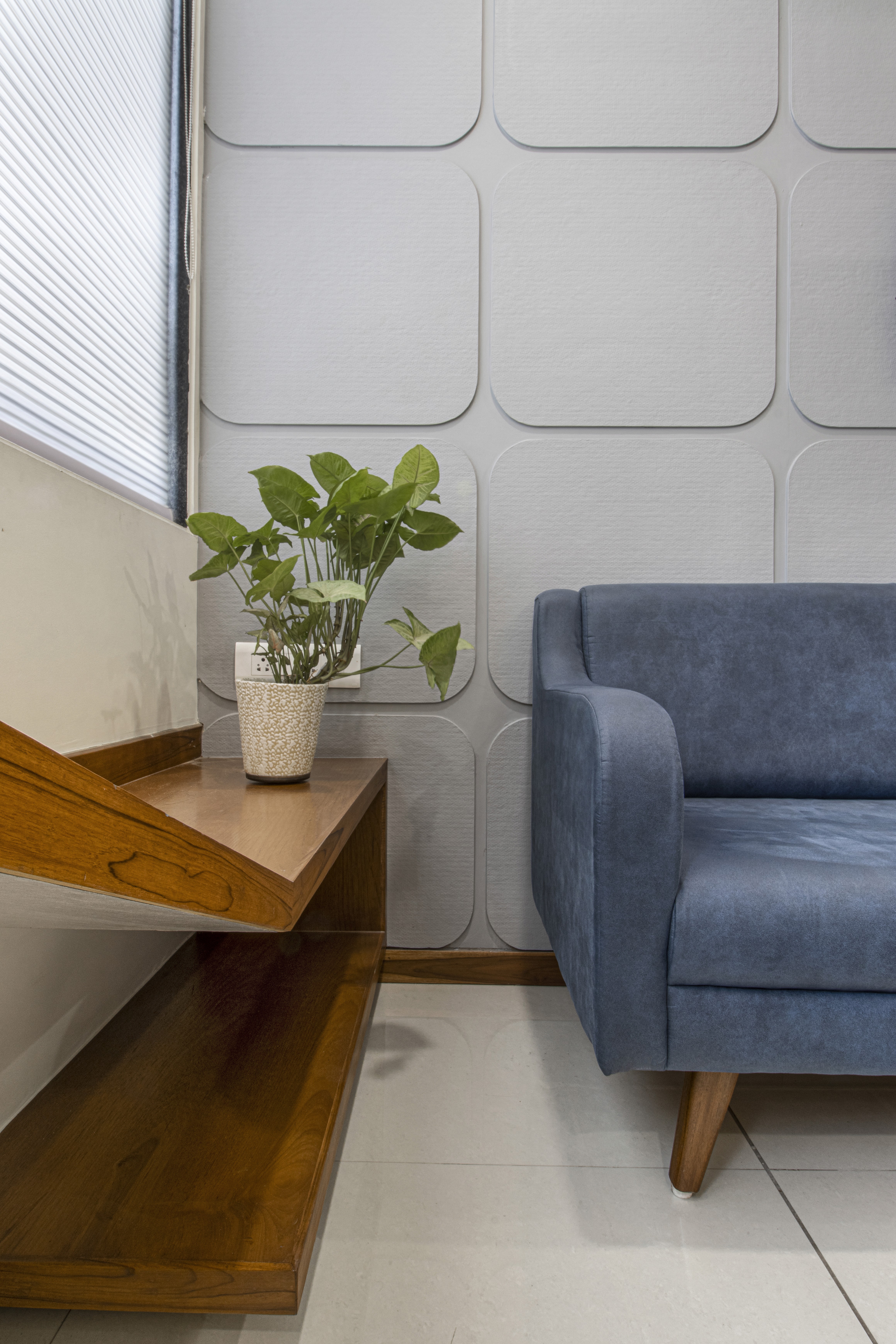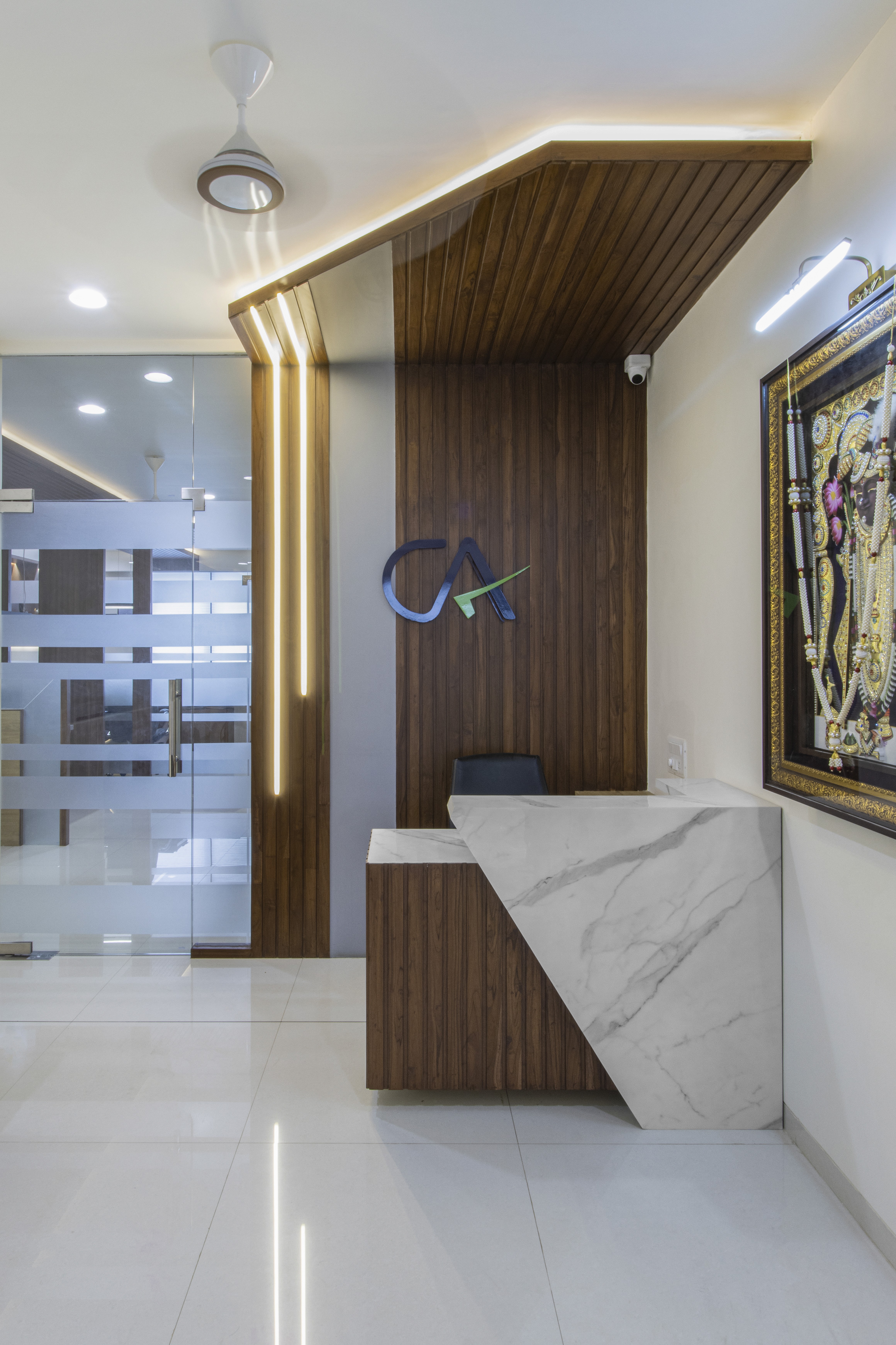 Mandowara and laddha Associates (CA OFFICE) Office with pure wood3n ceiling with natural polish work, which is enhanced by white coloured walls act as a background for wood. The office thoughtfully designed with simplicity and minimalism at its core., This reflects a refined aesthetics, where natural wood texture takes stage with harmonious shapes.
