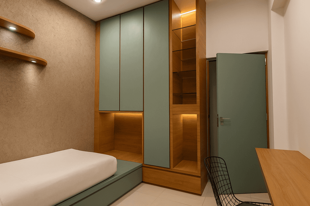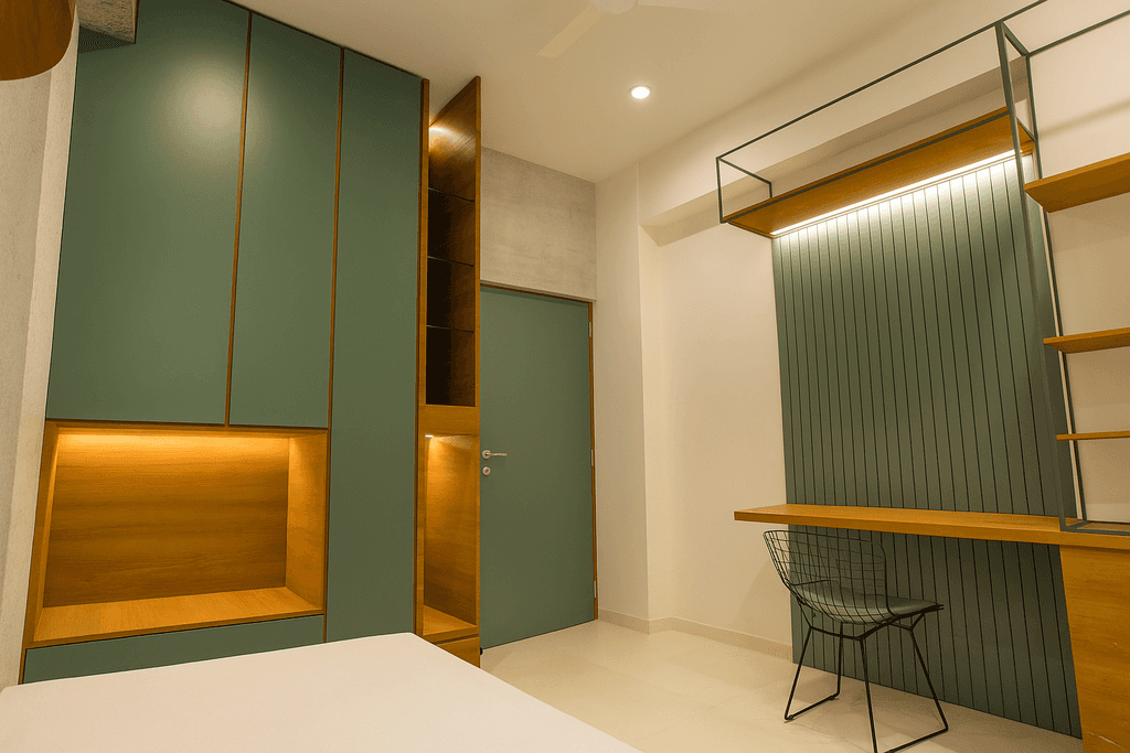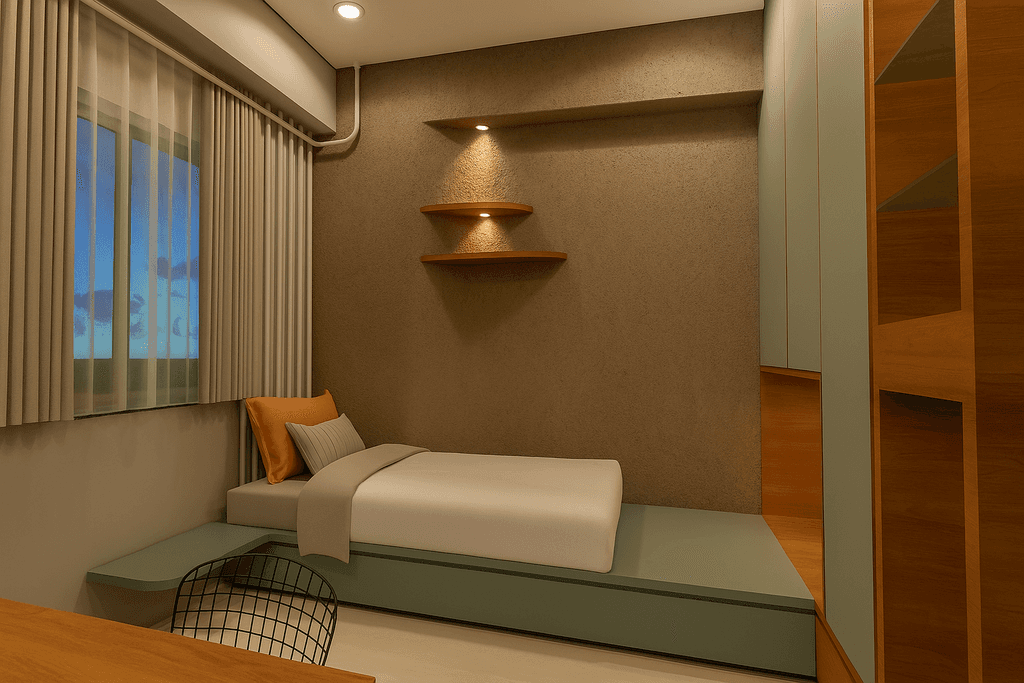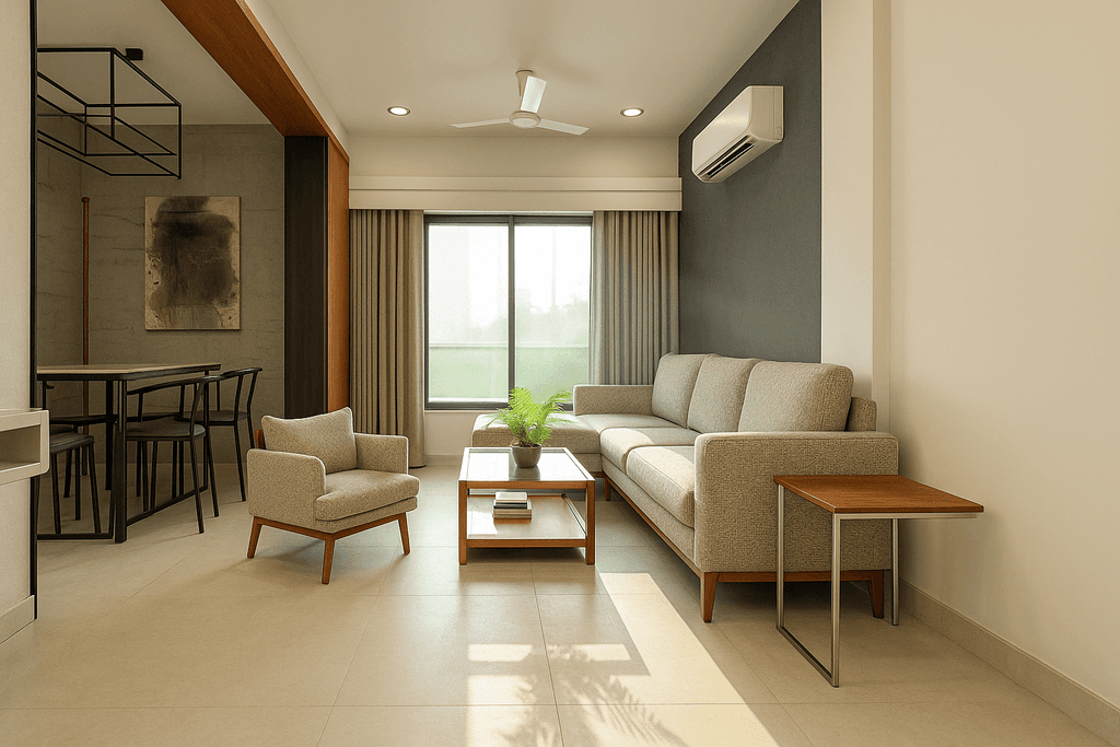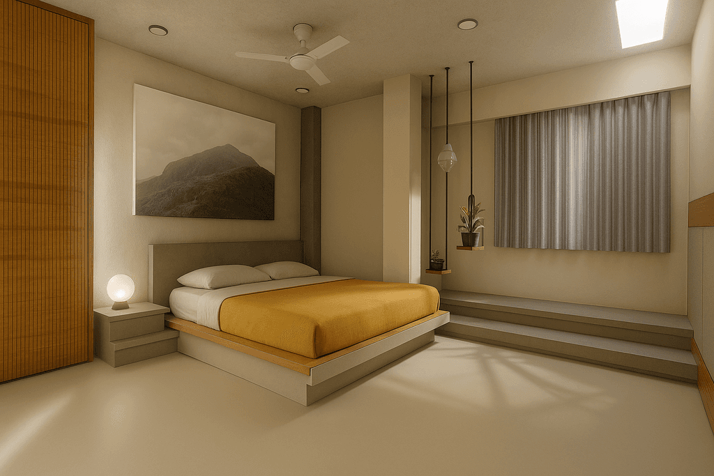A serene retreat with soft textures and a raised platform. Custom suspended planters and warm lighting enhance the room's cozy, earthy vibe. A refined entertainment zone featuring clean-lined furniture, muted tones, and a floating TV unit. Natural light and art create visual harmony. Open-layout seating paired with a dark feature wall. The balance of structure and softness is elevated with mid-century inspired furniture and smart zoning.
